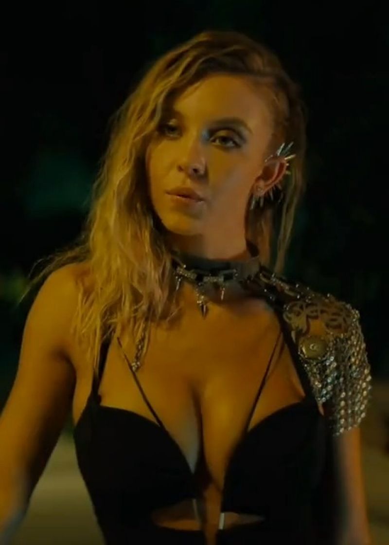 Sydney Sweeney braless boobs showing incredible deep cleavage with her big tits in a sexy black outfit from the 2021 movie "Night Teeth".
