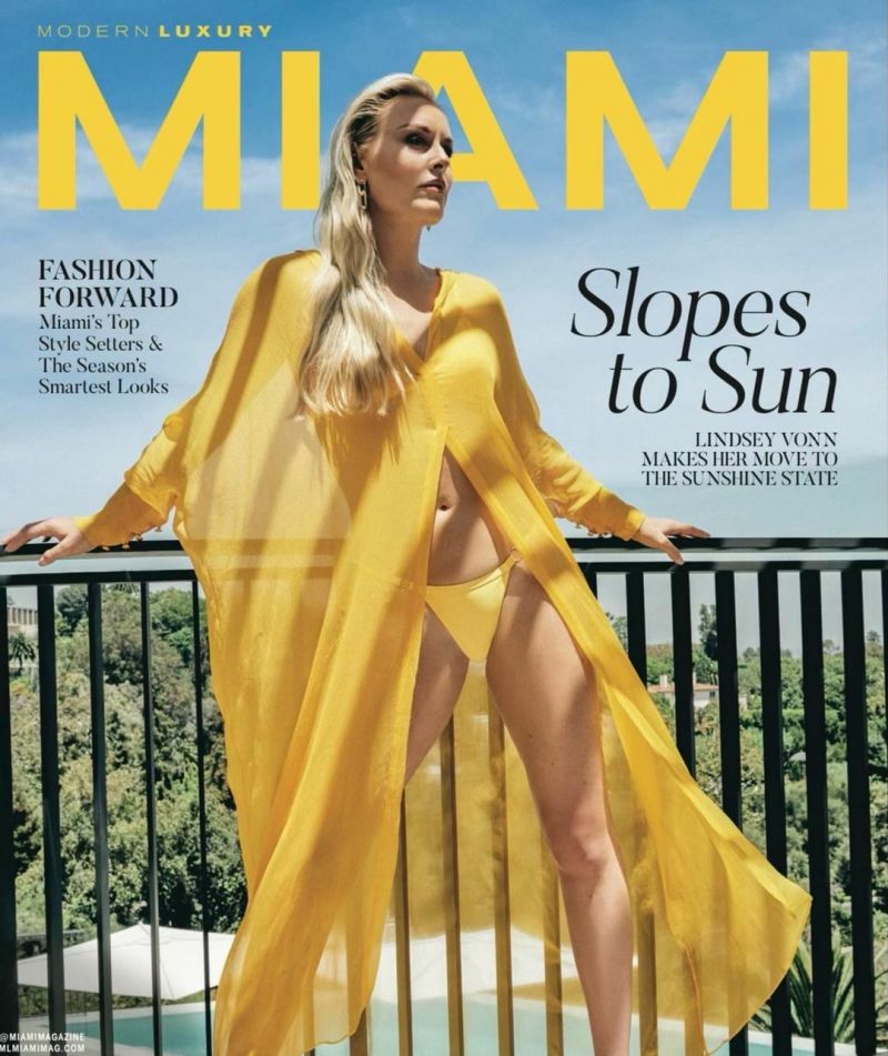 Lindsey Vonn braless boobs showing nice cleavage with her big tits and hot athletic body in swimsuits and open jackets for Miami magazine.