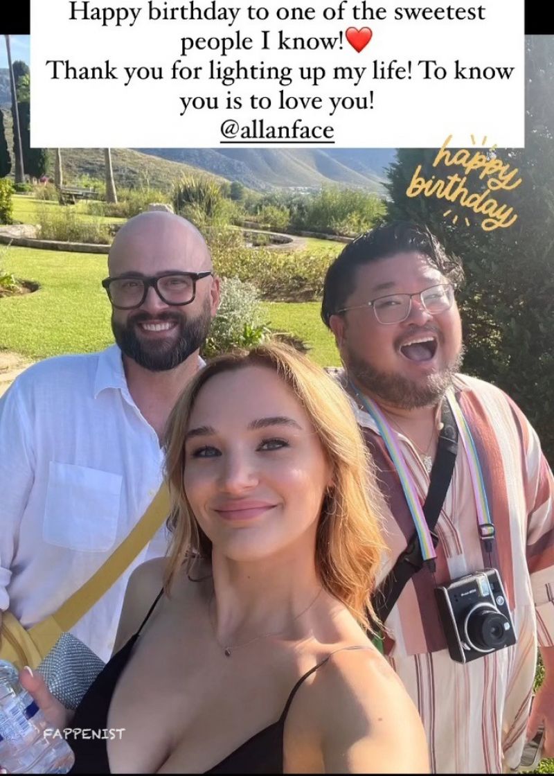 Hunter King braless boobs showing nice cleavage with her big tits in a sexy black dress outdoors at an event.