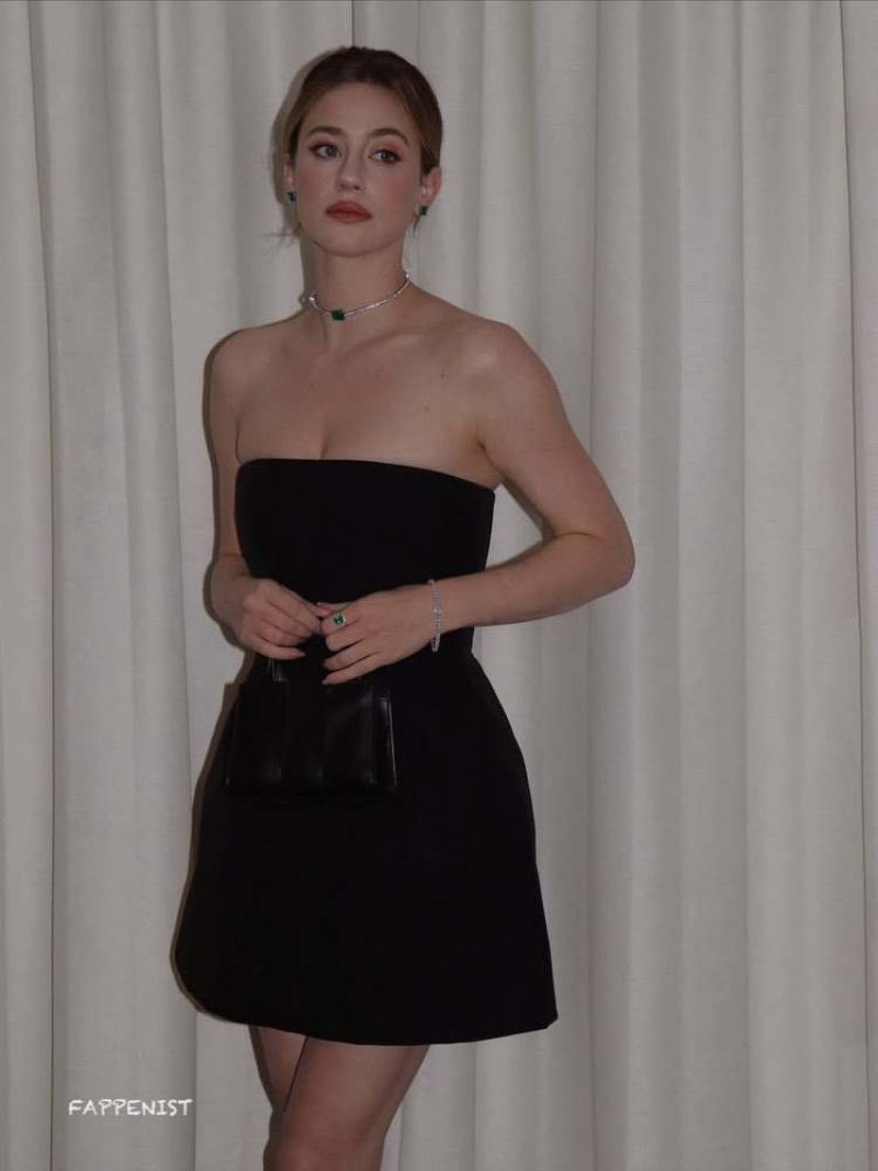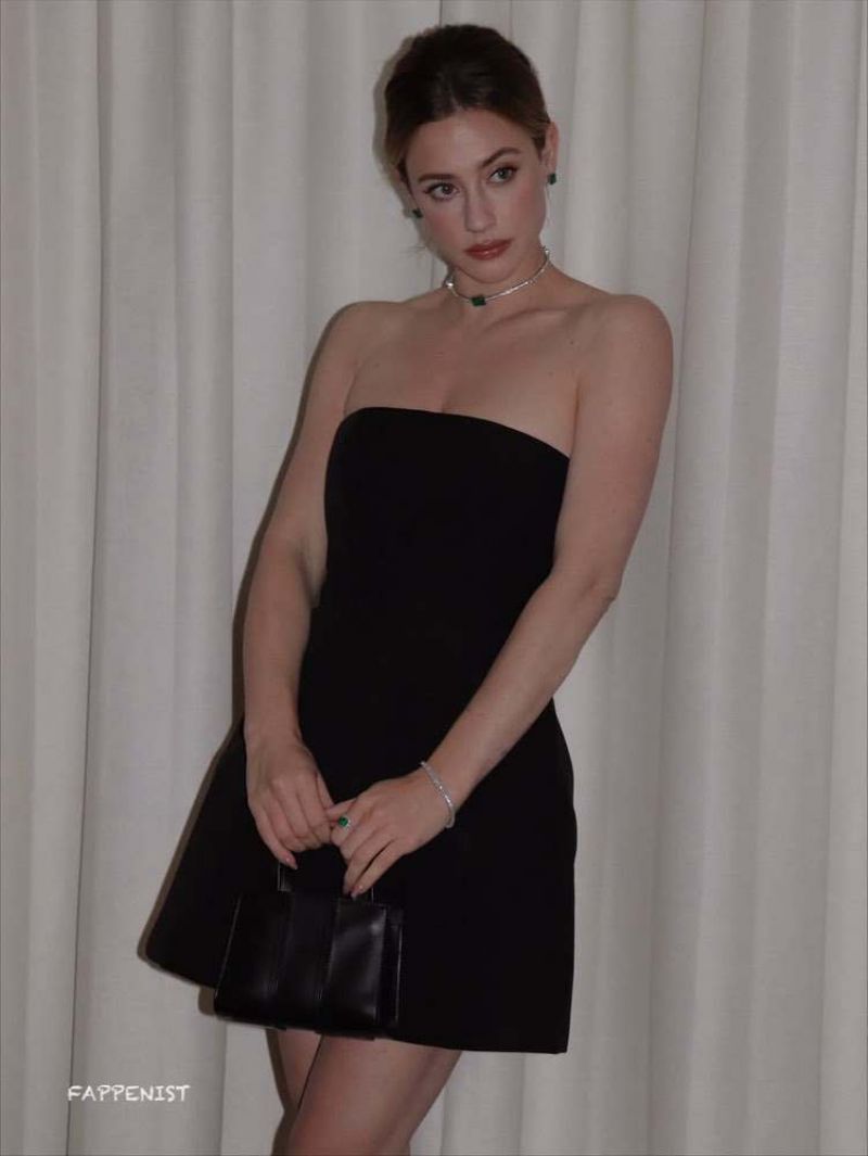Lili Reinhart braless boobs showing nice cleavage with her tits and legs posing in a sexy little black minidress.