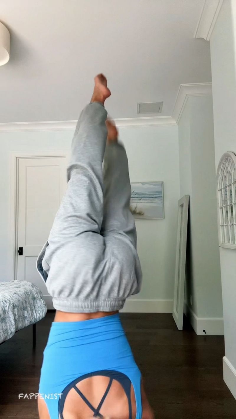 Livvy Dunne boobs showing incredible cleavage with her tits in a sexy blue tank top in her room and doing a handstand.