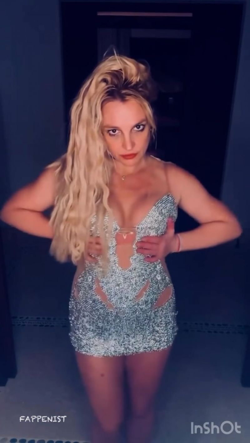 Britney Spears braless boobs showing incredible cleavage with her big tits pressed together and hot legs in a sexy low cut sparkly minidress.
