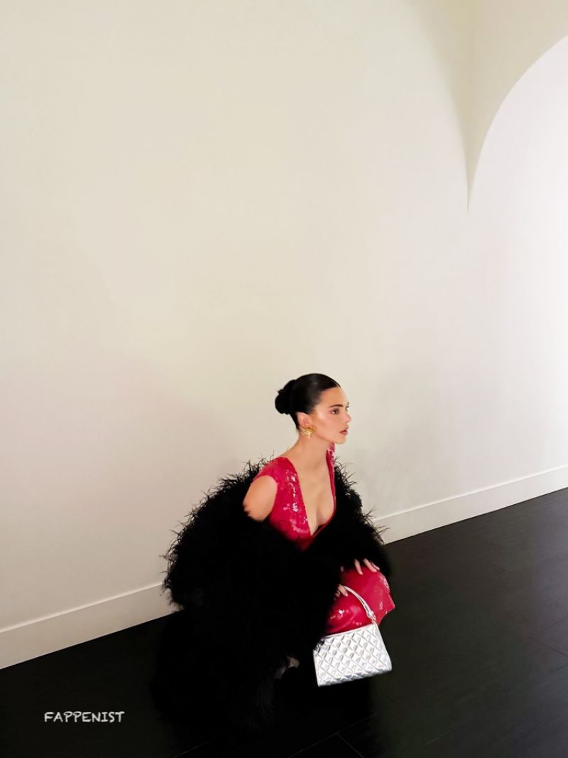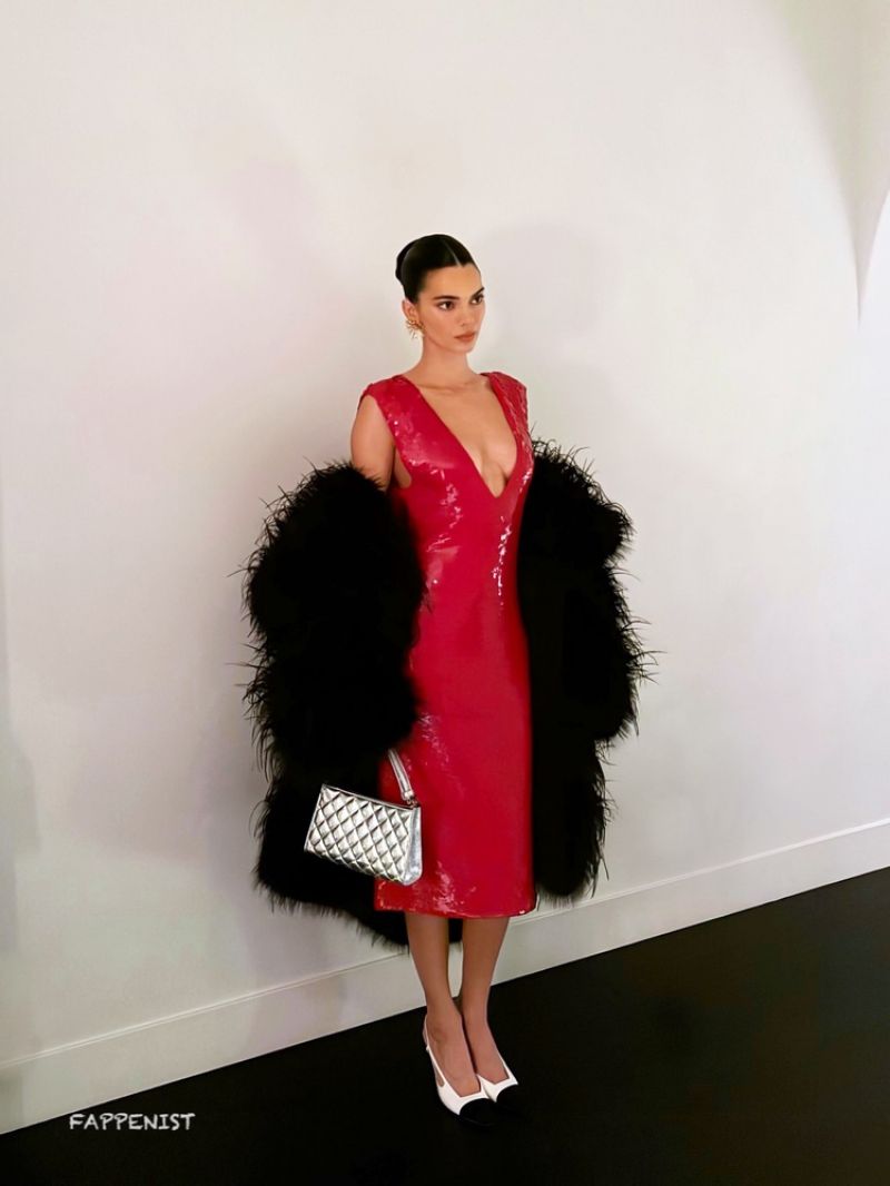 Kendall Jenner braless boobs showing nice deep cleavage with her tits in a low cut sexy red dress for Christmas 2025.