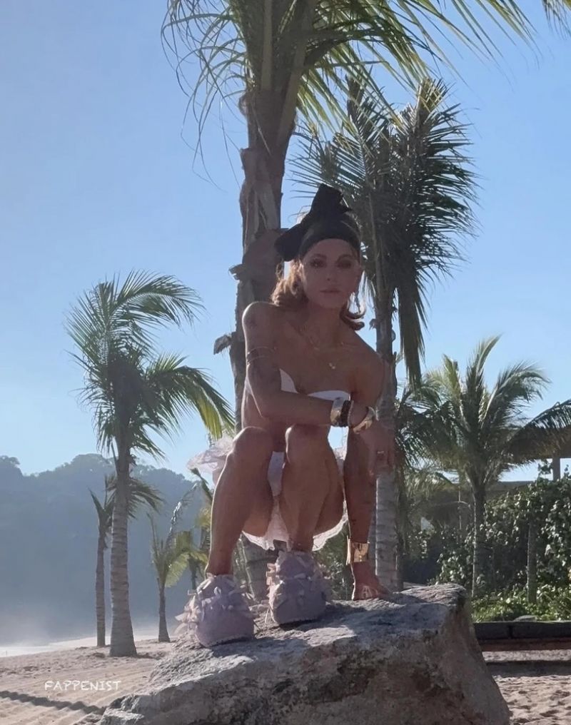 Kate Beckinsale boobs showing nice cleavage with her big tits, hot legs, and tight model body starting off 2026 in a sexy bikini top in her backyard.